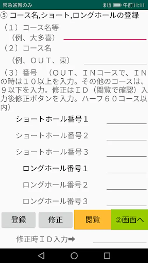 ・ Enter the course name, short hole number, long hole number, etc., and press the "Register" button. When you press the browse button, the registration status will be displayed. To correct it, enter the number next to the ID displayed in the browsing in the ID input field at the time of correction at the bottom, correct the short hole number, etc., and press the correction button.