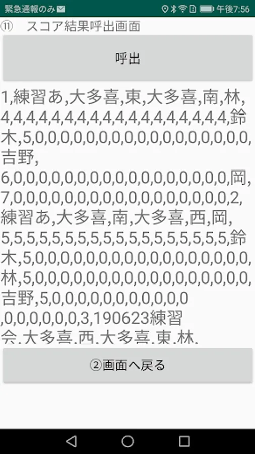 ・ ⑭ The text files of all scores are displayed on the screen (scroll to see the whole). The short and long hole numbers of the registered course are displayed at the bottom.