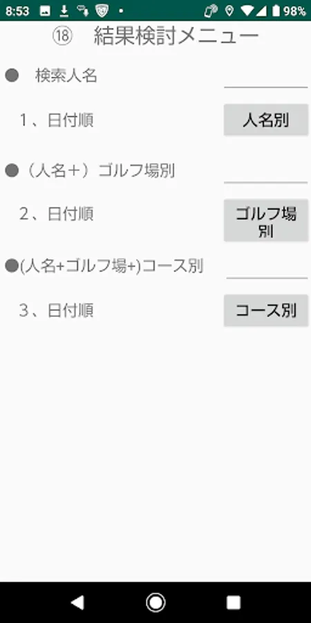 -Search the input data by 1, search by person's name, 2, search by golf course, and 3, search by course.