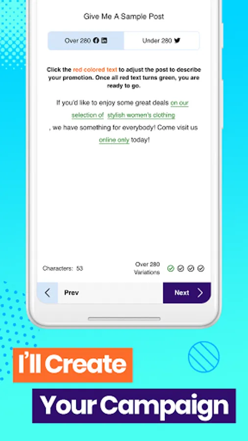 Choose your industry and campaign, tell me what you're marketing and watch your social media campaigns come to life. I will create and schedule your posts to create campaigns that last for days, weeks, or months in a matter of minutes. All you have to do is approve them.
