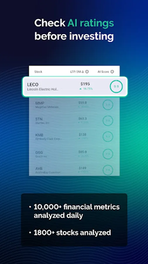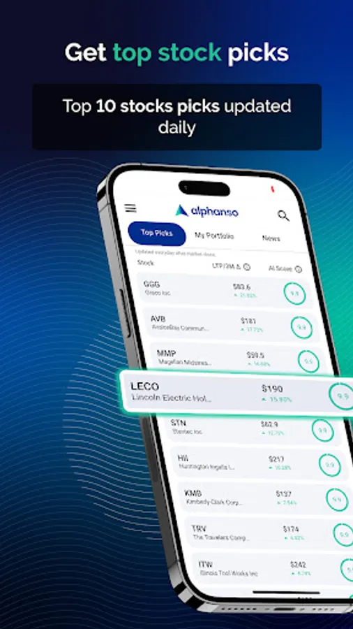 Boost your financial returns with intelligent investing. Alphanso provides you with smart AI recommendations designed for your portfolio. Get your personalized financial advisor and automate your investments with easy and effective stock recommendations powered by AI. Alphanso analyses 10,000+ financial metrics daily per stock to identify market trends early and generate actionable insights in the form of AI scores.
