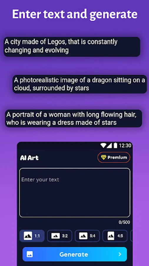 This AI Art: text to image AI app empowers you to express yourself artistically, whether you're a beginner or an experienced artist. Create stunning images, explore different styles, and bring your artistic vision to life with ease.