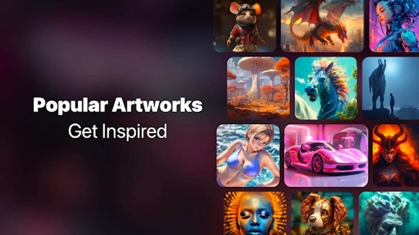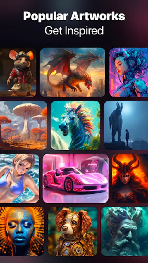 AI Art Generator provides you with a variety of inspirations to keep your idas flowing! Whether you want to create vibrant artwork or something dark and crazy, AI Art Generator has a collection of great artwork for you.