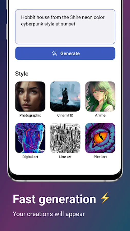 Introducing our revolutionary mobile app, the AI Art Generator! Unleash your creativity and explore the world of AI-generated art with our cutting-edge technology. With a wide range of features and artistic effects, our app is designed to provide you with an unparalleled digital art experience.