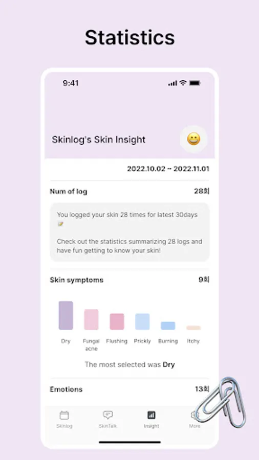It shows the statistics based on skin diary. Let me tell you what skin symptoms you had the most, what food you ate the most, and what emotions you felt the most!