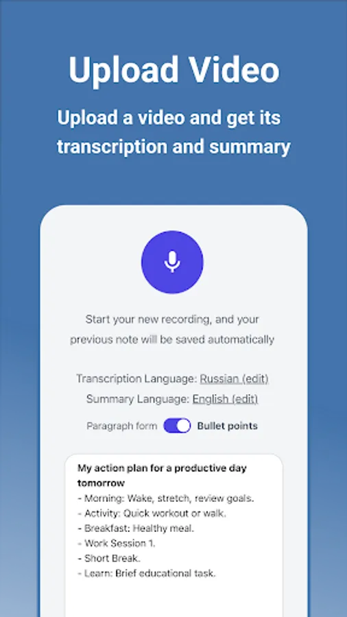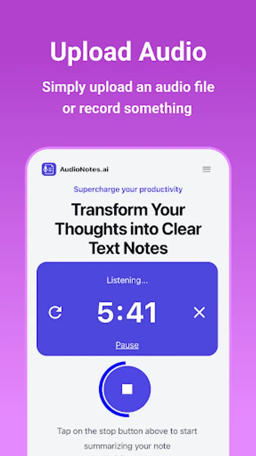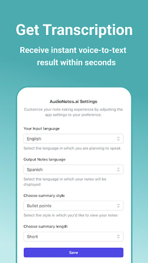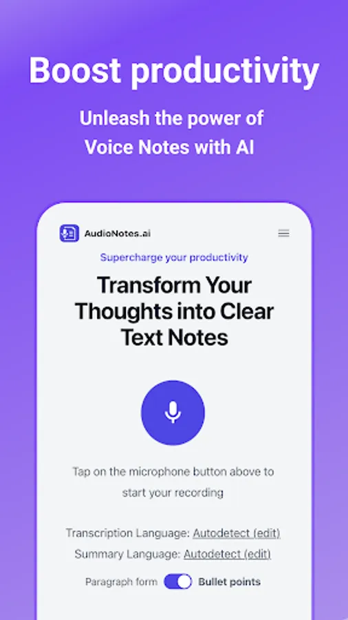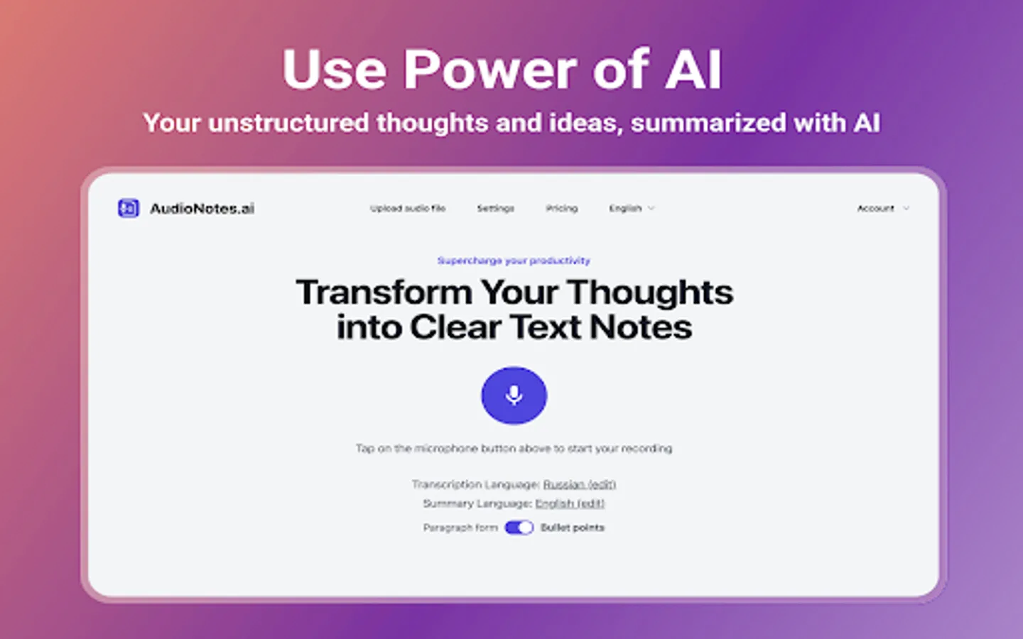 You have the option to record your voice directly or upload an existing audio file. Moreover, you can customize the length of the written summary and select your desired language. We employ advanced technology to guarantee the production of top-notch content. AudioNotes.ai is also accessible via the web!
