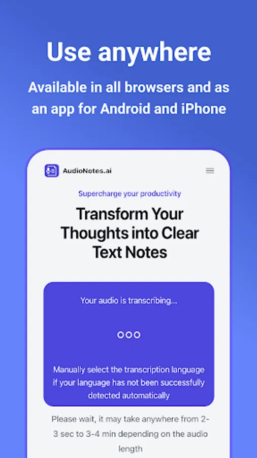 AudioNotes app allows you to effortlessly record, transcribe, and enhance audio from anywhere using AI. Whether you're capturing thoughts, ideas, interviews, meetings, or lectures, this app has you covered.