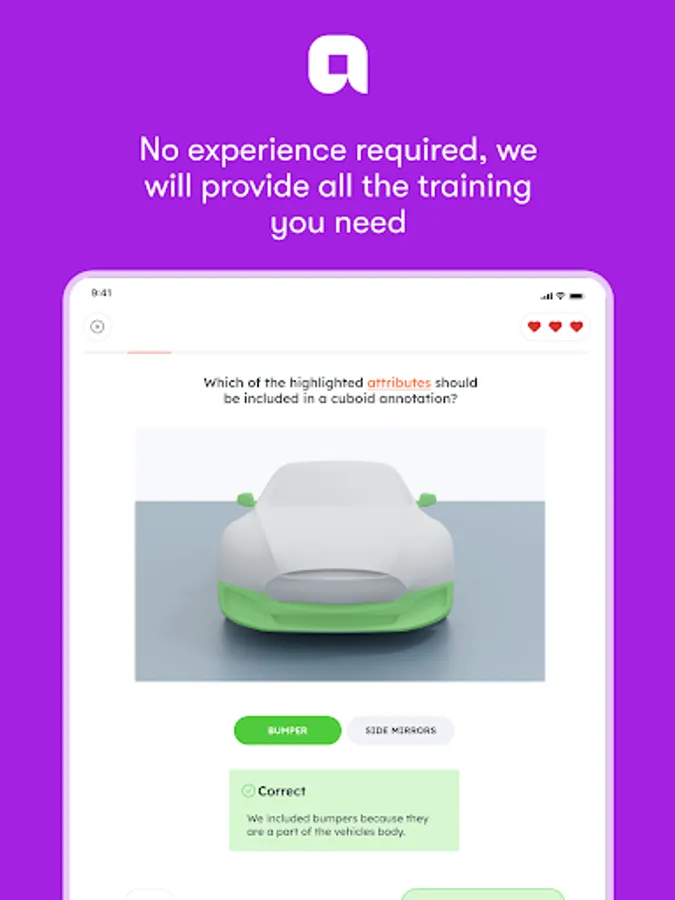 Quick Training. Avala is working on some of the most advanced technology in the world. But you don’t need to know anything to work with us. We will train you with easy-to-follow in-app lessons. In no time you’ll be helping us build the future of AI. Anyone can learn to do this work with us!