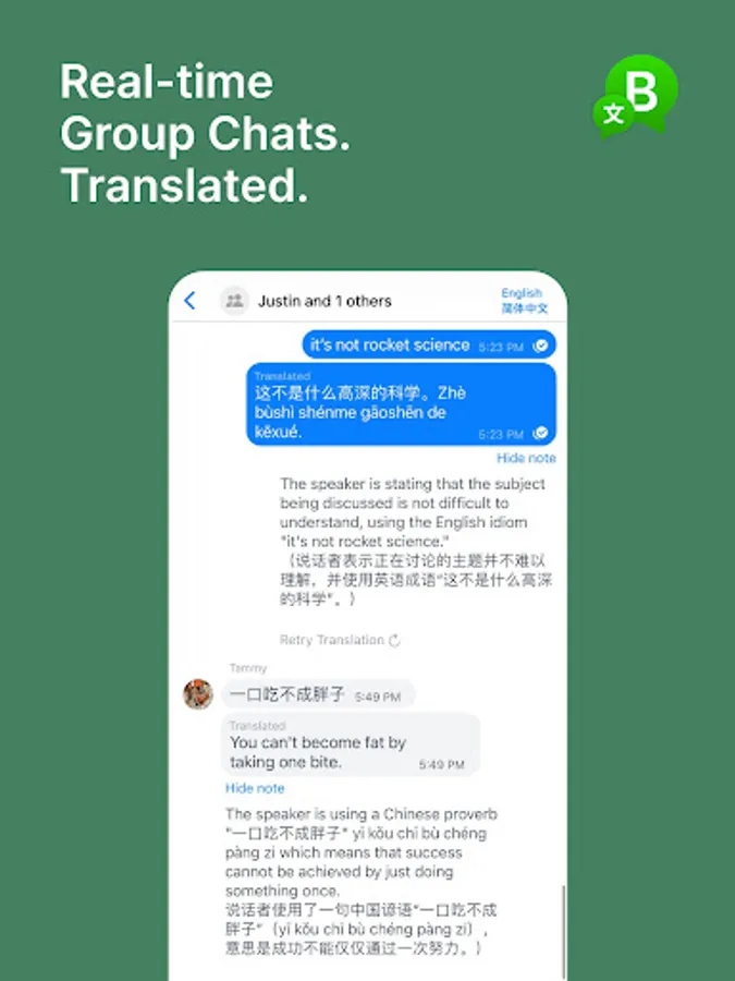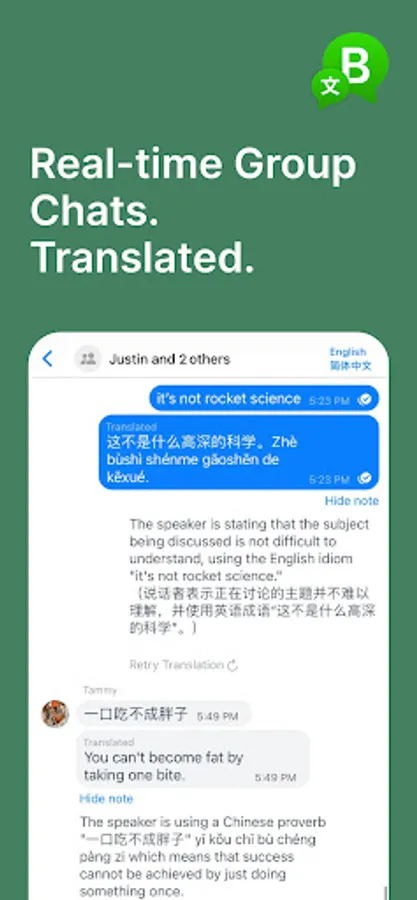 Group Chats: Chat naturally with multiple people with group chats in multiple languages.