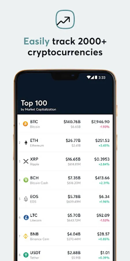 * Monitor 2000+ cryptocurrencies, including Bitcoin, Ethereum, Ripple, Bitcoin Cash, Litecoin, Eos, Cardano, Stellar, NEO, Monero, IOTA, Tron, Dash, Tether, NEM, Binance Coin, Ethereum Classic, VeChain, Qtum, OmiseGO, Verge, Lisk, ICON, Bitcoin Gold, Nano, Zcash, Ontology, Bytom, Steem, Populous, Dogecoin, and Waves.
