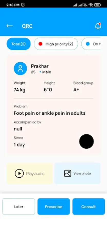 This is a doctor-patient engagement application. The app aims at managing doctors' time better with workflow optimizations and helps with the exchange of medical data with multiple stakeholders such as doctors, labs and pharmacies leading to efficient operations and better financial margins. It also enables access of qualified doctors to remote patients in a very efficient way by connecting with them at an early stage.