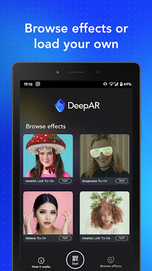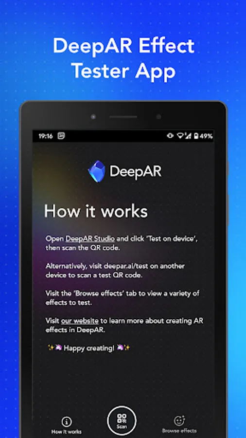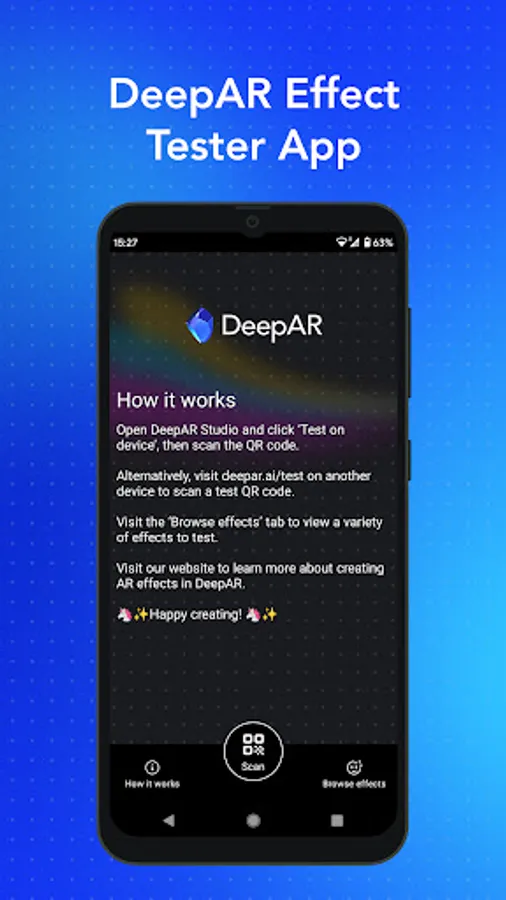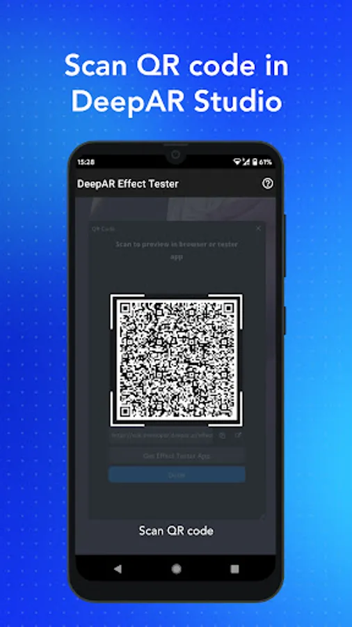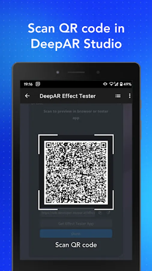 The DeepAR Effect Tester app is a companion app for our asset creation tool DeepAR Studio. It allows you to quickly test all your amazing AR creations on an iOS device by scanning the QR code from Studio. It allows the test in the native iOS app as well on mobile browsers too. Create, scan, test - it's that easy.