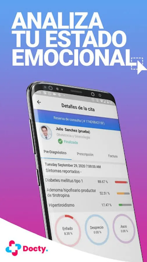 Docty allows you to access remote medical assistance and guidance directly from your mobile phone or via the web with your favorite health service provider. You can check your appointment schedule, receive medical attention, through our video call system with emotion analysis. Manage your prescriptions, laboratory tests and actively participate in the activities prepared for you in order to always stay healthy.