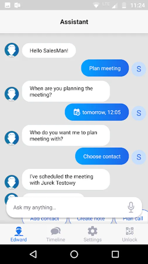 Edward, as your assistant automates repetitive tasks based on phone calls, messages and calendar. It automatically records your activities related with customers, draw conclusions and watches your daily plans. Access to both incoming and outgoing phone calls allows you to work with the assistant without the need to put additional data manually or remember to record this activity - everything happens automatically, saving time and providing the sales reps with the comfort of work.