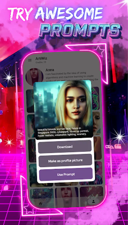 But that's not all. ArtiWiz also offers pre-built professional prompts designed by experienced artists to help you create amazing AI art. And with instant art download, you can download your art as soon as it's done and share it with your friends and family.
