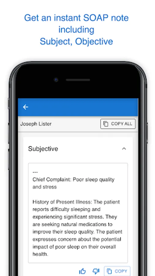 • Automated SOAP Notes: Say goodbye to manual note-taking. Our advanced AI instantly transcribes and structures your patient interactions into complete and precise SOAP notes.