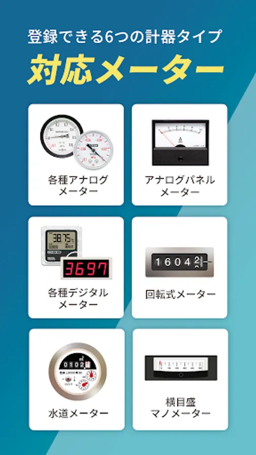 -Just take a quick shot of the meter with your smartphone. AI reads the numerical value from the image and automatically completes the data entry. -Compatible meters are analog (needle) meter, analog panel meter (β compatible), digital meter, rotary meter, water meter, horizontal scale manometer (β compatible). It can be read even with an old meter.