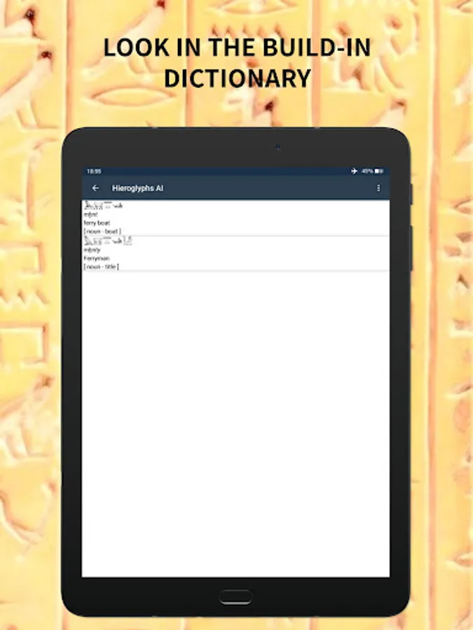 Welcome to Hieroglyphs AI, the app designed to help you translate ancient Egyptian inscriptions and texts of the Classical period. Our app is based on cutting-edge Artificial Intelligence (AI) technologies that use Deep Learning neural networks to recognize hieroglyphs accurately.