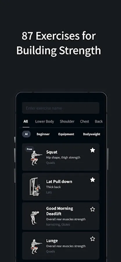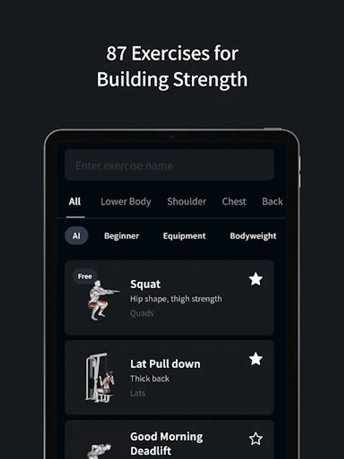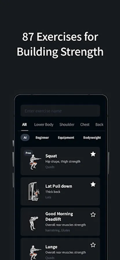 3. 87 exercisesLearn exercise tips, targeted muscles, and similar exercises of the 87 exercises.