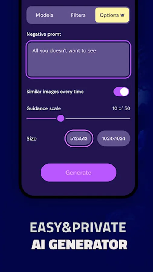 Advanced options: Customize your artwork even further with our new tools, including negative prompt, seed, adjustable size, and GFC scale.