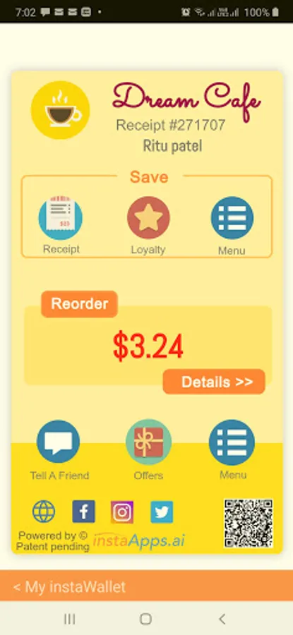 Store and access instaReceipt, instaMenu, instaOffers, instaTickets and more.