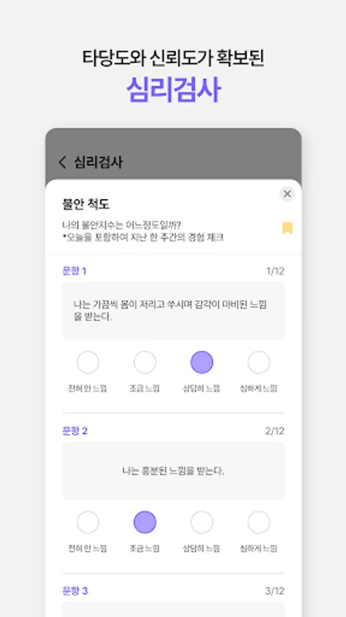• Through 22 self-diagnostic psychological tests such as depression, anxiety, stress, and addiction, we help you objectively diagnose and understand your condition.
