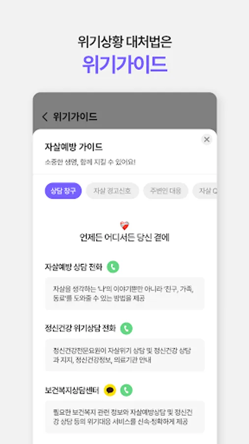 • Provides countermeasures to respond to youth crises such as suicide, self-harm, school violence, and sexual violence, and guides you to specialized institutions in case of emergency.