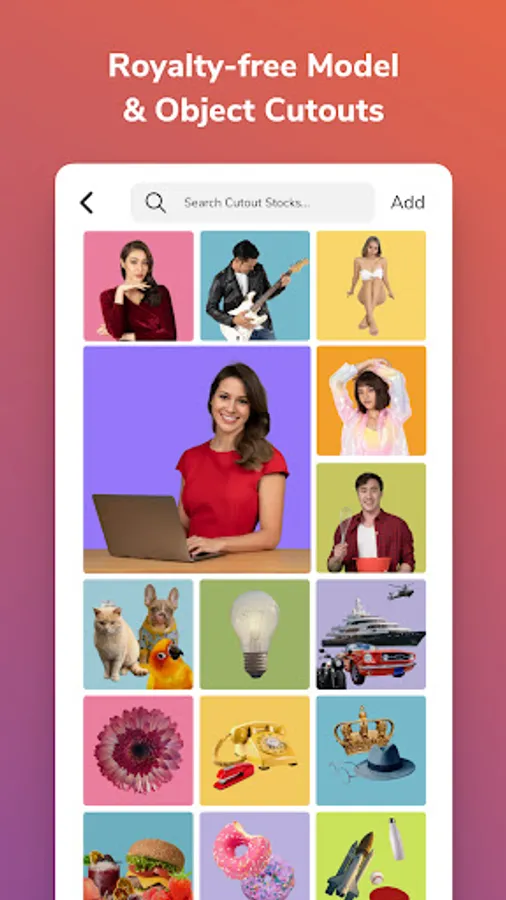 Create high-quality ads easily by yourself. We provide mega-libraries of ready-to-use royalty-free model & object cutouts to make your ads look like a pro. No more expensive model hiring & studio shooting. Save money & time.