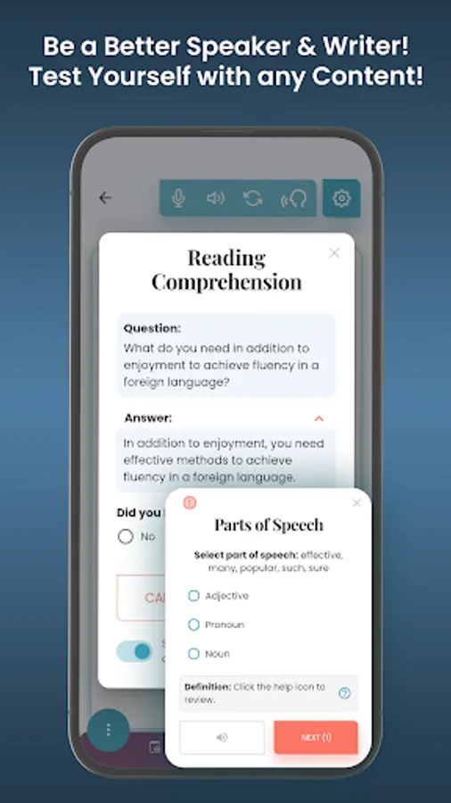 Receive real-time feedback to improve your English pronunciation or spelling. Strengthen your English grammar skills through interactive quizzes, real-time comprehension, and parts of speech testing.