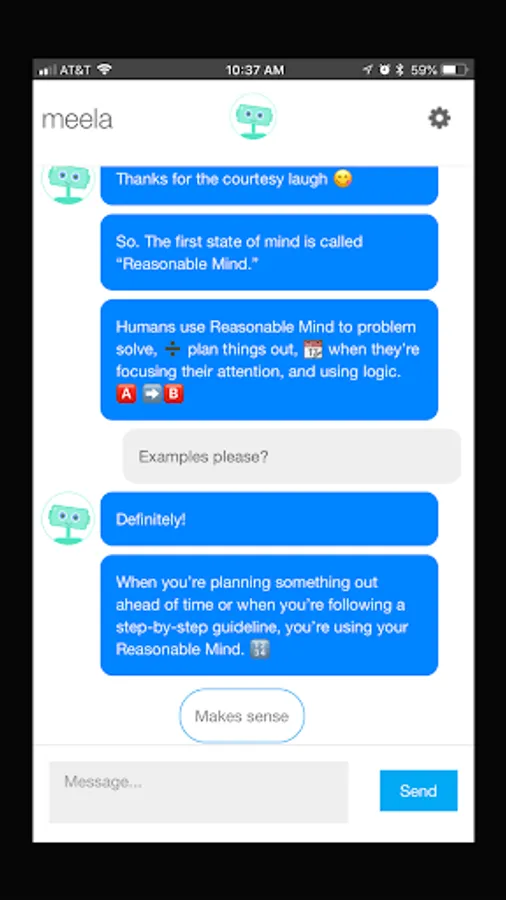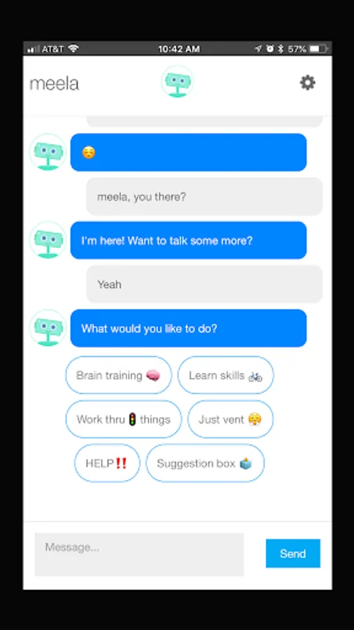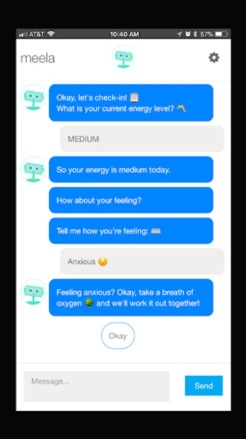 Created by a team of mental health professionals, Meela is your small and mighty AI chatbot for your mental health and wellness needs. Meela uses Artificial intelligence, and the science-based foundations of Cognitive Behavior Therapy (CBT) and other evidence-based therapies to keep you mentally and emotionally fit with short daily and directive therapeutic conversations. Meela is full of empathy, humor, and wit, and is there for you day and night to help you manage difficult feelings and live a full and meaningful life! Whether you see a human therapist or you have never experienced any therapy before, Meela is ready to talk with you anonymously at any time as your therapy companion. Meela is right in your pocket whenever you need her to teach you something new, help you practice what you’ve learned, do a quick check-in, or work through a feeling. Meela helps you track your own progress with her too!