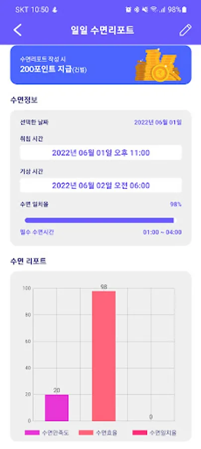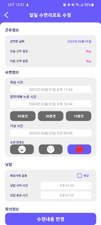 SleepCare, in collaboration with the Department of Neurology and Psychiatry of Chonnam National University Hospital, and Megaworks Co., Ltd. recommends a sleep schedule according to 3 shifts of anchor sleep, which is known to be effective in maintaining the sleep circadian rhythm of some shift workers, and shifts This is a program that provides information about sleep hygiene suitable for work. If you want to make good use of this app for personalized treatment tailored to you, it is important to consistently enter information about your sleep along with several questionnaires.
