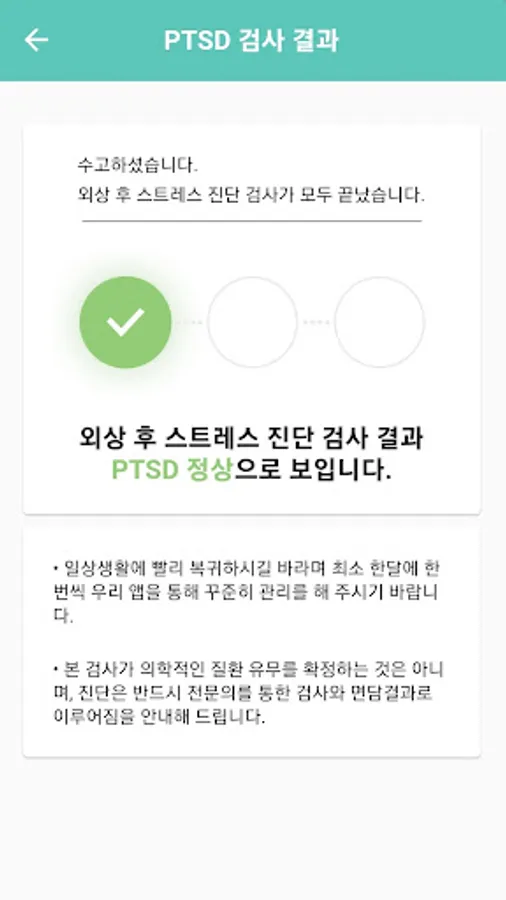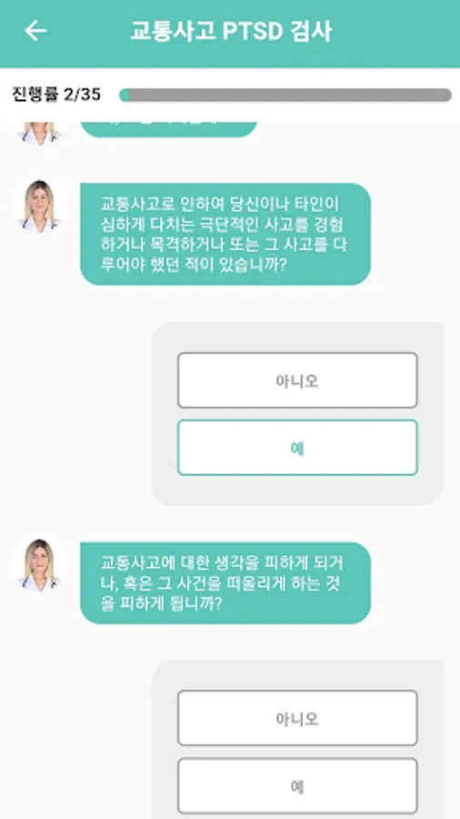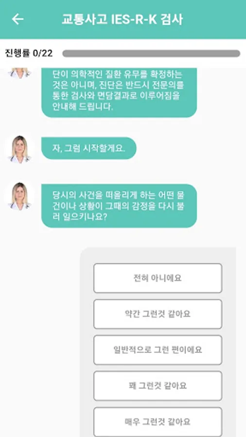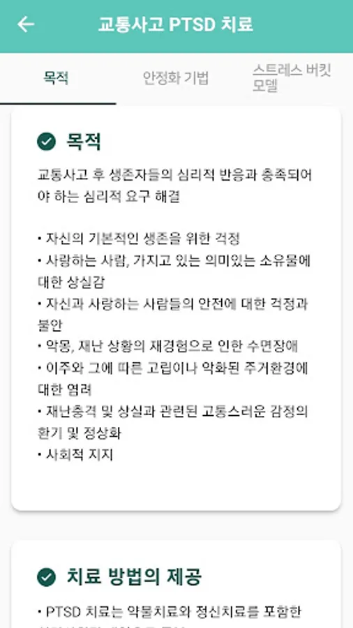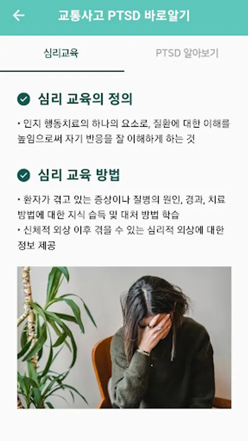 To alleviate the above symptoms, it is necessary to minimize the impact of post-traumatic stress disorder through early intervention in patients who have suffered a traffic accident. This app provides information you can accurately understand about post-traumatic stress disorder after a traffic accident, diagnoses the degree of post-traumatic stress disorder by yourself through a chatbot, and helps you alleviate post-traumatic stress disorder while watching a video according to the diagnosis result. We provide a function that can. We hope that many people who have suffered a car accident can quickly get out of post-traumatic stress disorder by using this app.