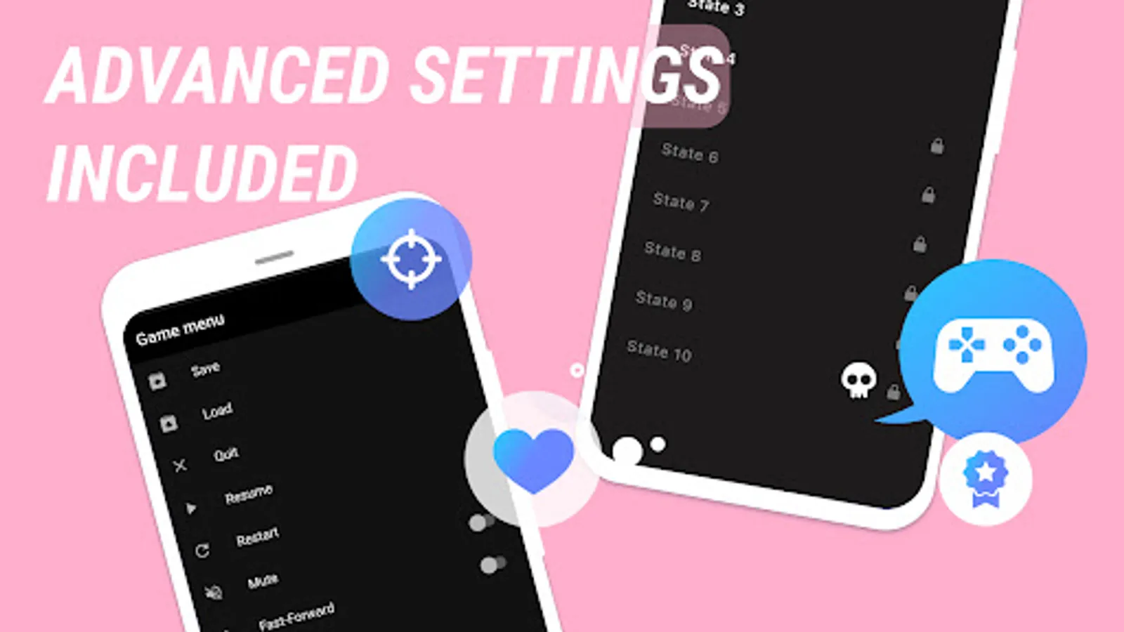 - Game Emulator contains advanced features: load state, save state, fast-forward....