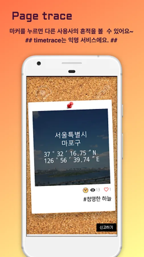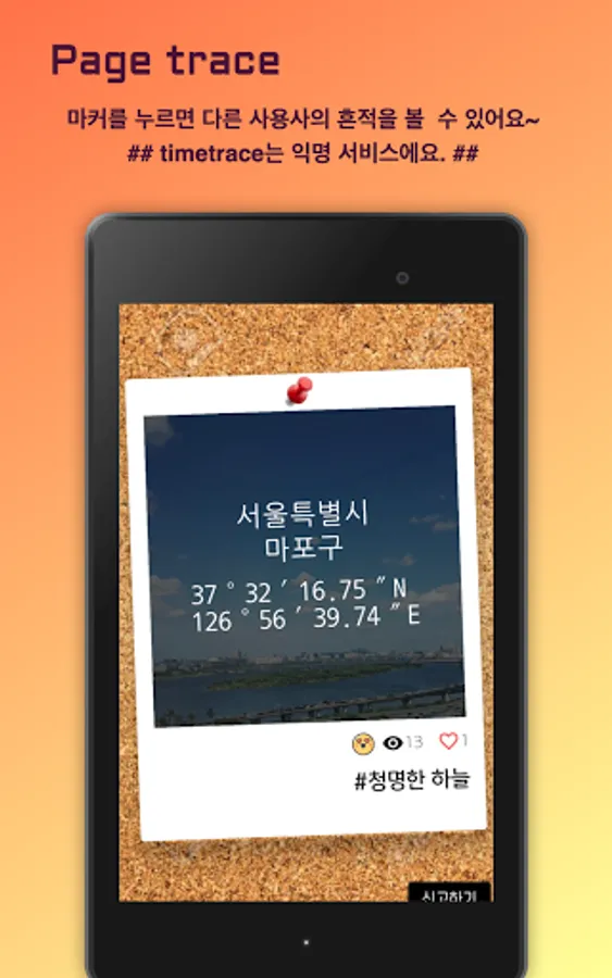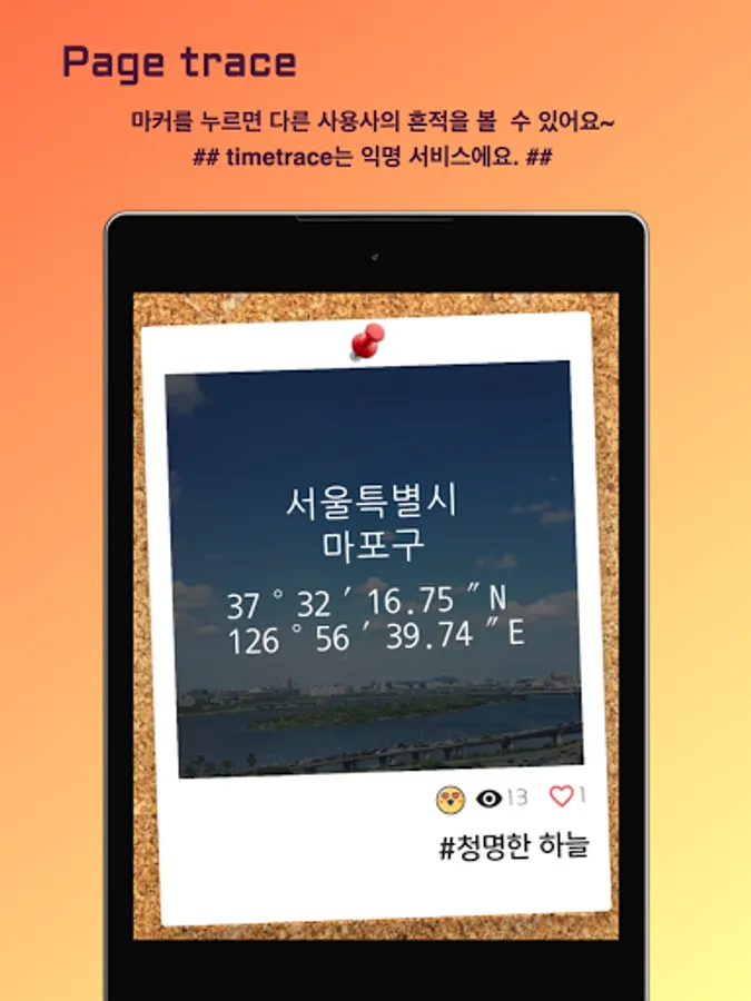 timetrace is a location-based social network and album service that allows you to mark your location and leave a simple message with a photo. The photo taken by the user shows the location information of the place where the marker was left, latitude and longitude.