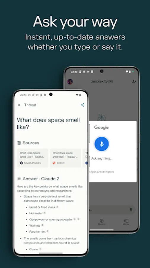 · Ask with voice or text: Instant, up-to-date answers whether you type or say it.