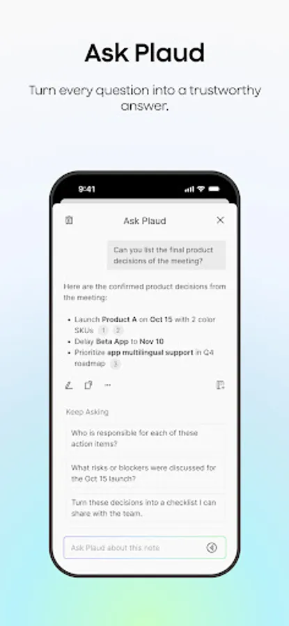 - Ask Plaud: Get reference-based answers, generate insights, and save as notes