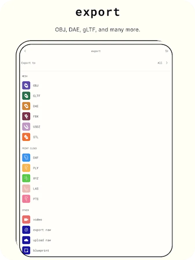 ● Export mesh data in .obj, .dae, .fbx, .stl, & .gltf