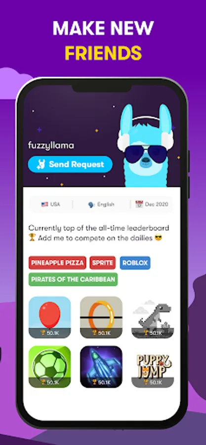 Customize your profile with your interests (don’t forget your own personalized Llama) and find friends from around the world. Leave comments on your favorite games and connect with other fans.