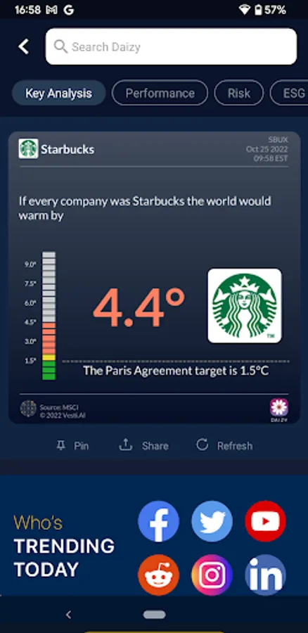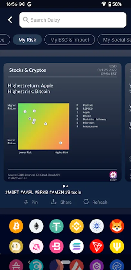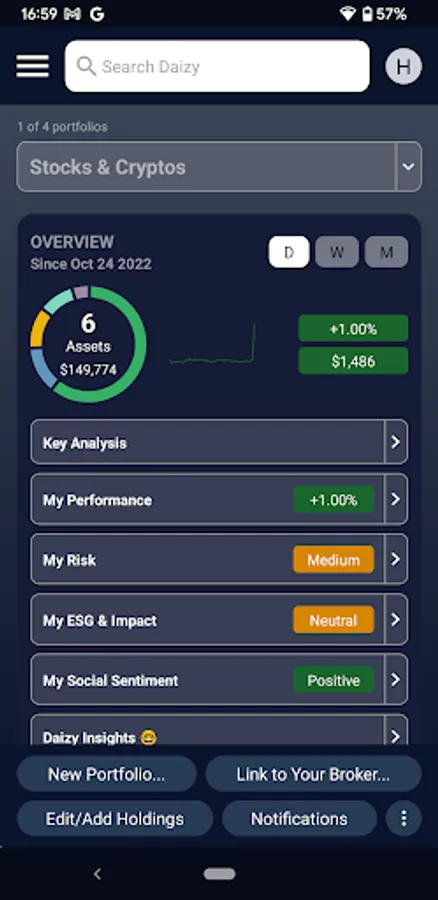 There are many investment analysis apps out there, but Daizy has been designed to offer you more than simple performance tracking and news flow. Our portfolio analysis and stock deep-dives help you uncover and understand data usually reserved for professional investors. Our unique visualizations have been created to give you context and understanding of this data so you can become a better investor. Our stock, ETF, and crypto deep-dives give you a full breakdown including performance, risk, impact, news, climate, carbon, sentiment, market, correlation, controversies, morality, and more!