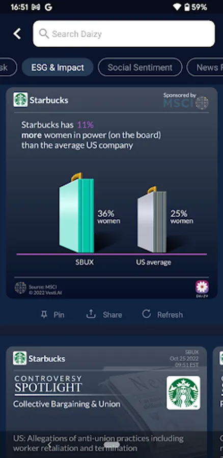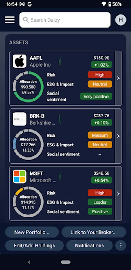 Daizy also shines a light on your portfolio as a whole so you can get the full picture on your investments. You can create a watchlist, a portfolio, or link to your live broker account. Daizy will show you not just your overall portfolio performance, but complete risk and ESG analysis via the dedicated playlists. See which are your best and worst holdings and which are contributing most to your risk. We also analyze your ESG score so you can see how you compare to the overall market when it comes to the environment, social impact, and corporate governance. You can also easily see all the holdings in your portfolio such as the latest price, current market value, risk, sentiment, and ESG scores. Daizy makes it easy to get a quick snapshot of your portfolio and dive into the detail when you want to.