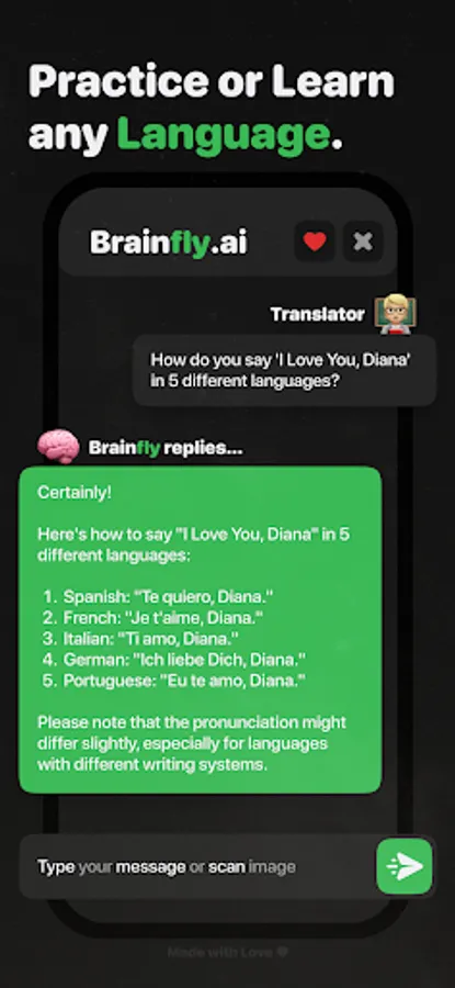 Brainfly's multilingual capabilities allow you to chat in any language you desire. Translate text, learn, and practice your language skills. Let Brainfly be your language tutor!