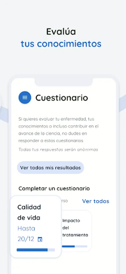 Finally, if you wish, you can take tests to test your knowledge, questionnaires to deal with different aspects of the disease or participate in studies to contribute to the advancement of research. Personal data is fully protected and anonymous.