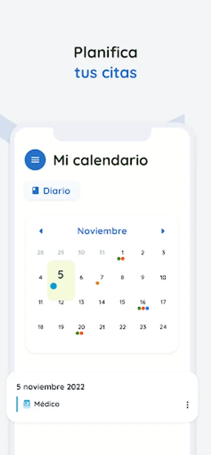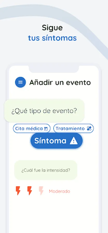 This section helps you with the daily management of your disease. You can create reminders to take the treatment and your medical appointments. In addition, it helps you keep track of your symptoms for better monitoring: moment, intensity, duration, etc.
