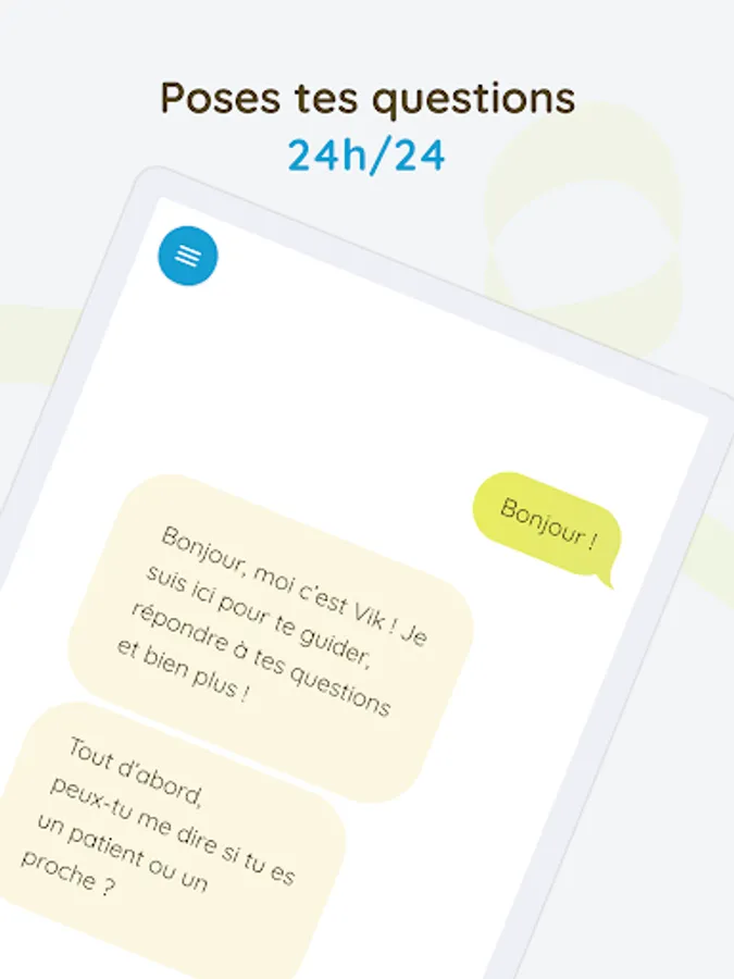 Vik Lymphomas is the health companion that helps you and answers all your questions about this cancer, but also those of your loved ones 24/7 (symptoms, crisis, diagnosis, etc.). Thanks to him, you will be able to better understand your pathology as well as your course of care since he provides personalized advice through questionnaires.