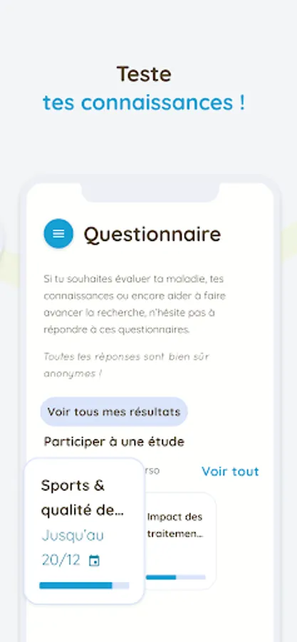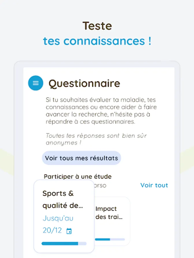 Finally, if you wish, you can take quizzes to test your knowledge, questionnaires to discuss different aspects of the disease (preconceived ideas, symptoms, follow-up, etc.) or take part in studies to help improve the research. Personal data is fully protected and anonymous.
