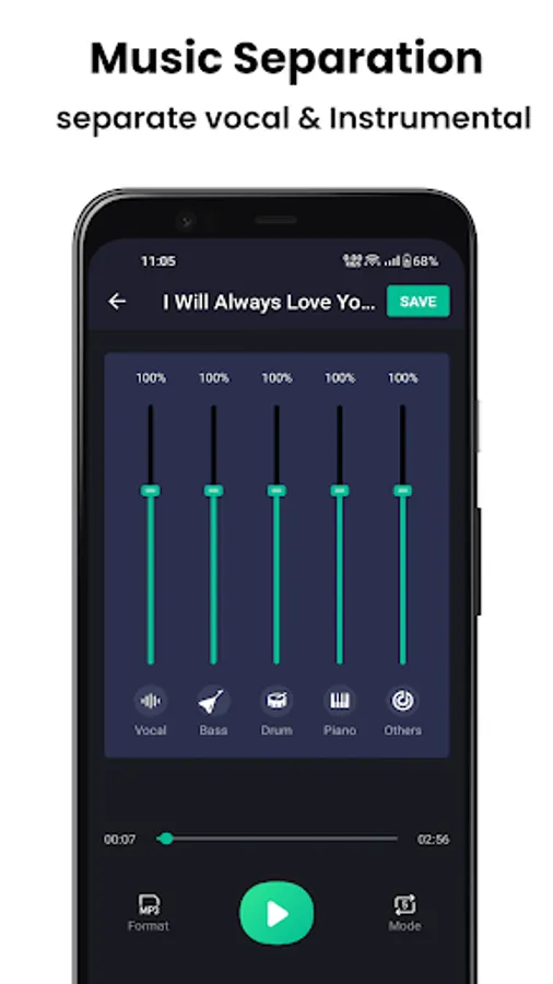 But we are more than just a vocal remover! Vocal Remover also functions as a comprehensive music editor. From merging tracks to adjusting sound levels, we give you the tools to create the perfect track. Want to convert MP4 to MP3? No problem! Our app effortlessly transforms file formats to suit your needs.