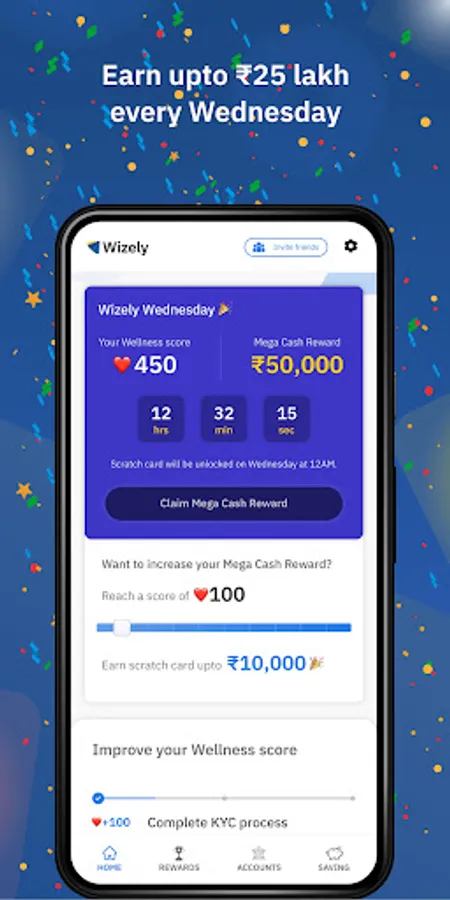 And the best part? Every Wednesday Wizely has a Mega Reward of upto Rs. 25 lakhs just for maintaining good financial habits through improving your Financial Wellness Score!