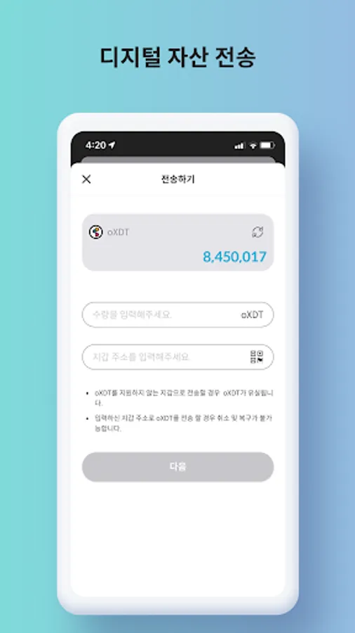 Quickly transfer your oXDT or KLAY to another wallet.