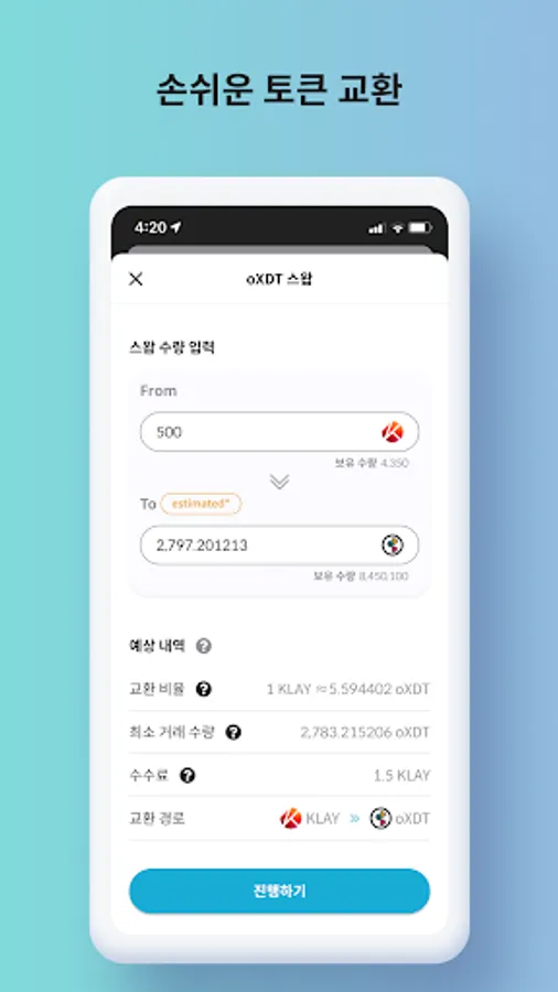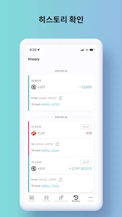 Exchange oXDT and KLAY, and view the swapped history at once.