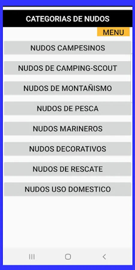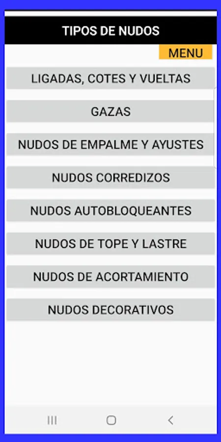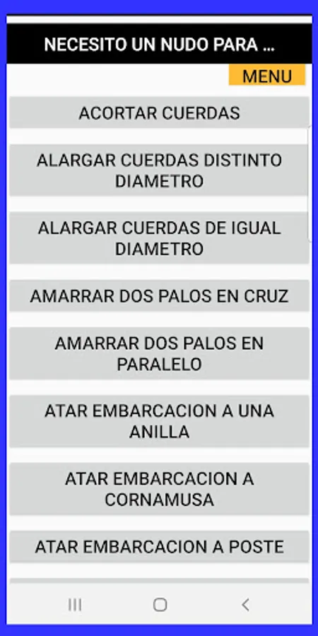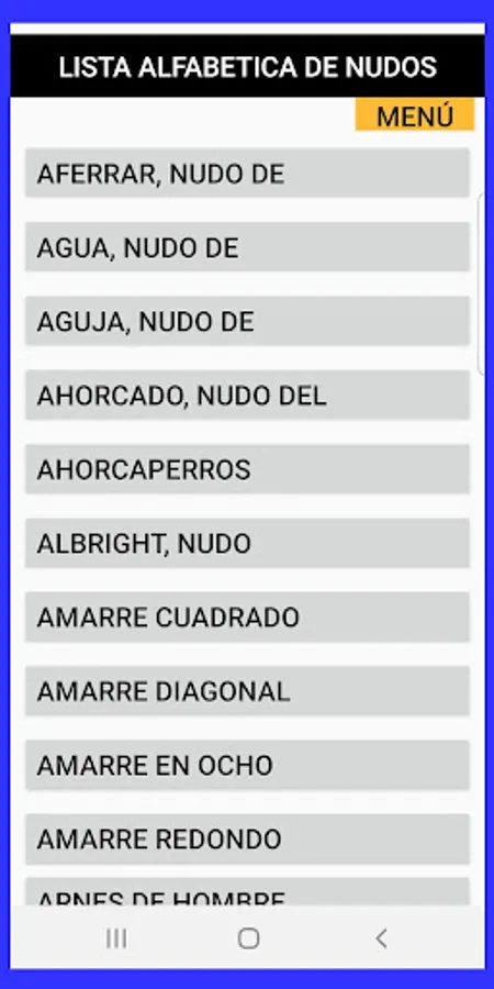 The application I need knots, consists of an alphabetical list of almost 200 denominations of knots. It includes guides to search, choose or classify the node that interests you and the description of each one.